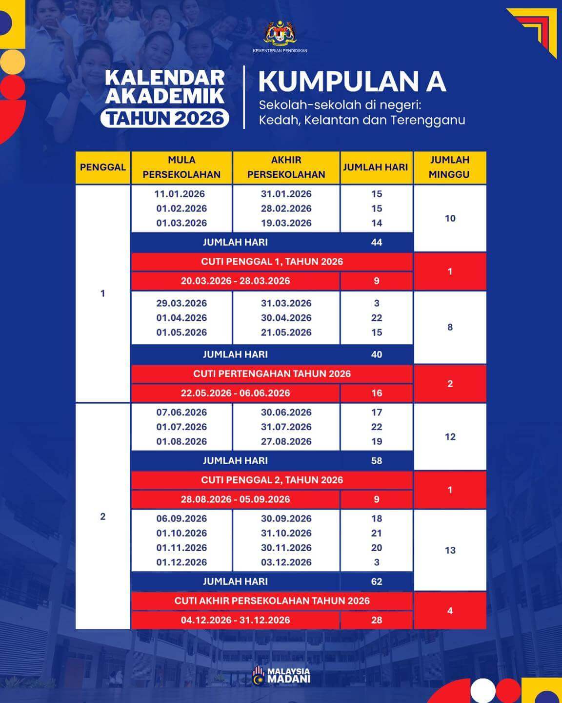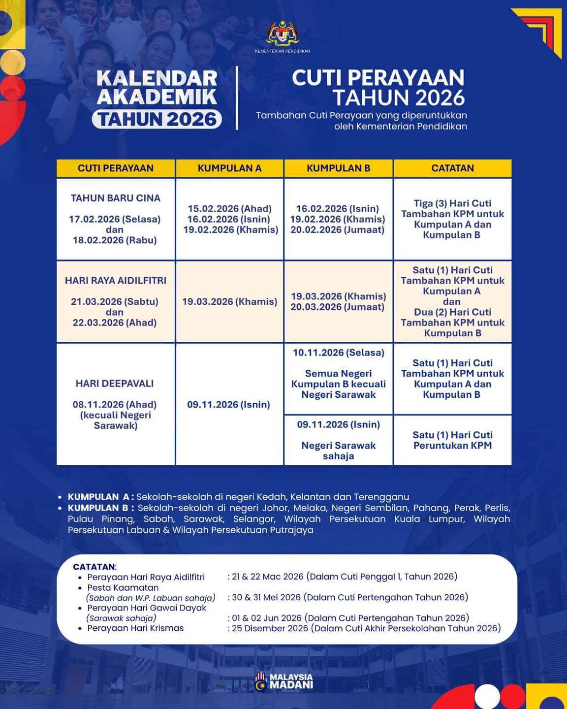 This web page shows the school holidays for Malaysia on year 2026. The tables will be updated from time to time according to the changes from the Ministry of Education (MOE) Malaysia. MOE separated the school holidays into two groups, where group A is states that having weekend on Friday and Saturday, while group B is states that having weekend on Saturday and Sunday.